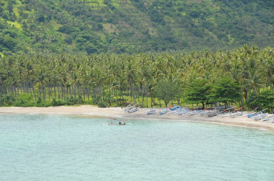 The ride follows Lombok’s northern coastline with views over the sea and black volcanic beaches. At a small fishing village the motorcycles are parked before boarding a boat excursion.